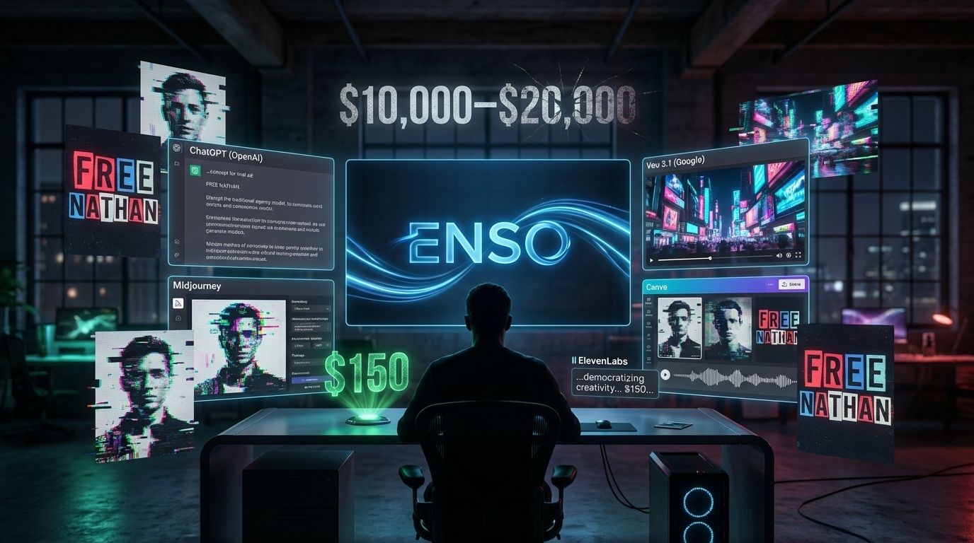 All-AI production: Enso built the entire “Free Nathan” campaign using only generative tools. ChatGPT handled scripting, Midjourney created visuals, Veo 3.1 generated video, Canva managed editing, and ElevenLabs produced voiceovers. A single person assembled the full campaign end to end in roughly six hours.