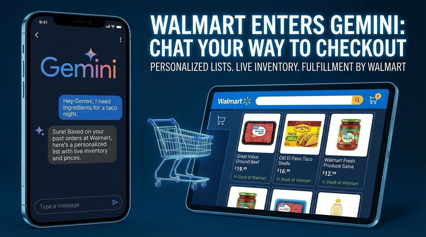 Walmart is bringing its entire catalogue to Googleās Gemini app under the Universal Commerce Protocol. Users will chat to shop and get personalised lists, linking their accounts for live inventory and pricing. Orders will be fulfilled via Walmartās network, challenging Amazonās grip on conversational shopping starting in 2026 globally.