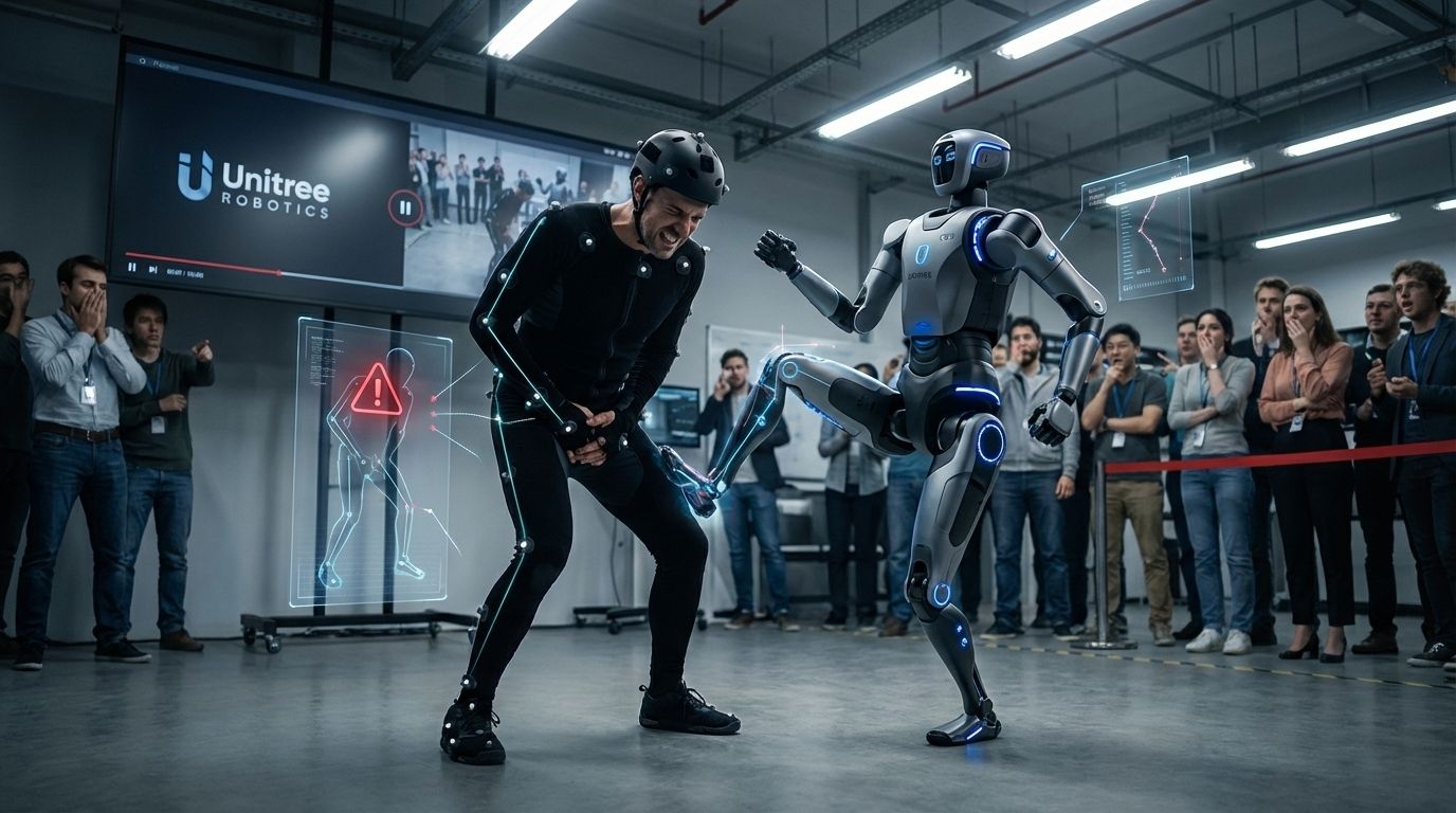 Viral mishap: A motionācapture operator attempted a high kick while training Unitreeās G1 robot. Because the robot mirrored his movement exactly, his leg shot up into his own groin, sending him collapsing and the robot copying his pain. The clip quickly gained millions of views.
